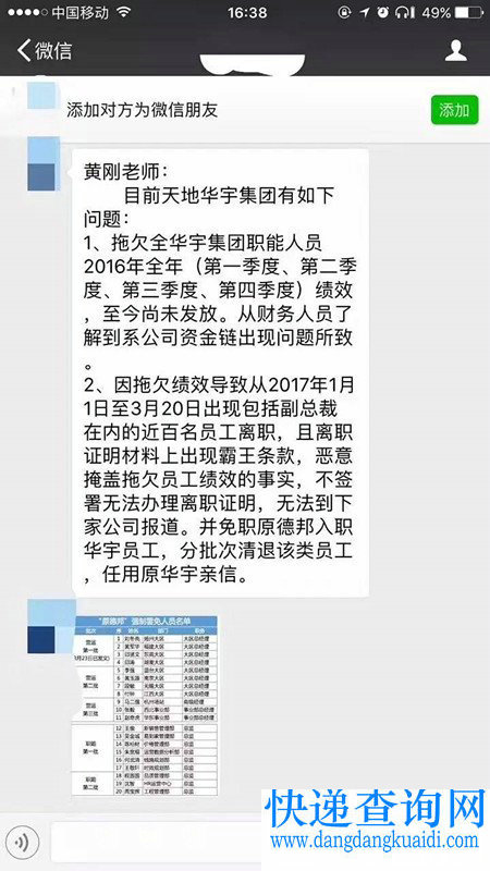 爆料人称“这些人都是原来中信收购华宇后从德邦外聘来的,现在原华宇CEO杨铸回来接盘,一些高层(原德邦外聘来的)之前已经全部搞走了,这次是把原来外聘德邦的地方老总免职……估计这一两个月还有一批”。