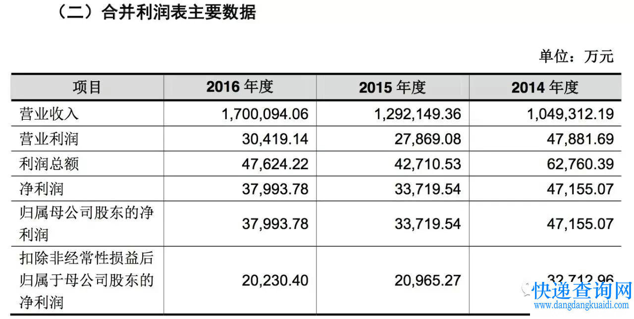 根据招股说明书显示,德邦物流2014年、2015年、2016年,三年营收分别为1049312万元、1292149万元、1700094万元,净利润分别为47155万元、33719万元和37993万元,自有员工人数分别52520人、75244人和114108人。