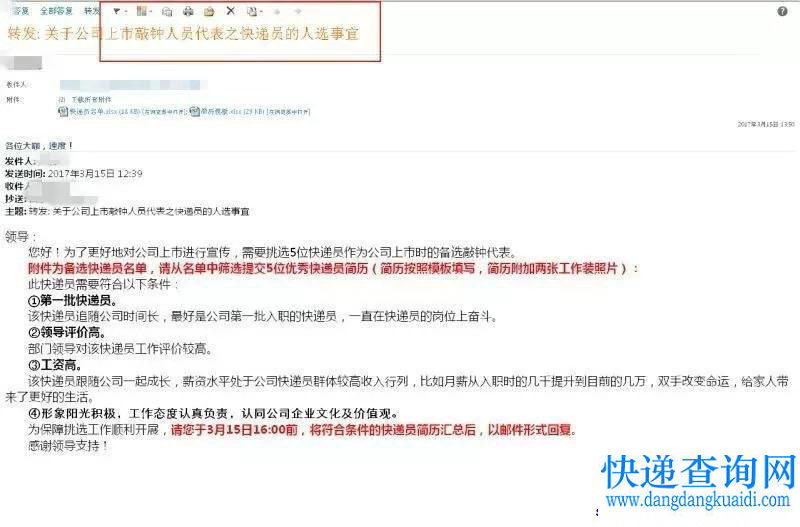 根据德邦内部邮件,其计划挑选5位快递员作为上市时的备选敲钟代表,对于人选有4项条件,包括追随公司时间长,最好是第一批入职的快递员;部门领导评价高;工资高,形象阳光,工资态度认真负责。