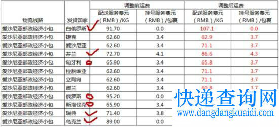 爱沙尼亚邮政经济小包的路费调整最多。其中,发往白俄罗斯、芬兰、瑞典和乌克兰的包裹运费涨幅较大,白俄罗斯的涨幅最大为15.4元/KG,接近16元;发往俄罗斯、匈牙利和斯洛伐克的包裹运费却下调了,其中俄罗斯降幅最大为22.2元/KG,这将是多数卖家的好消息。