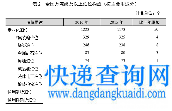 全国万吨级及以上泊位中,专业化泊位1223个,比上年增加50个;通用散货泊位506个,增加33个;通用件杂货泊位381个,增加10个。