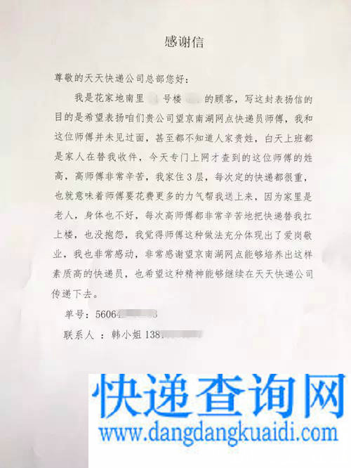 感谢信是花家地南里一位客户寄来的,信中她提到“高师傅非常辛苦,我家住在3层,每次定的快递都很重,也就意味着师傅要花费更多的力气帮我送上来,因为家里是老人,身体也不好,每次高师傅都非常辛苦地把快递替我扛上楼,也没抱怨……”高师傅这一爱岗敬业的举动深深地感动了这位客户,她寄来感谢信,对高师傅表示谢意,也感谢天天快递能够培养出这样高素质的快递员。