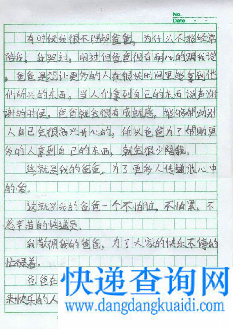 于涛是佳木斯申通中转部的一名快递员,说起这篇作文,他没想到儿子能写得这么好“有时候农忙,家里老人没有时间照顾孩子,我就把于子轩带到快递公司和我一起上班。同事们都认识他,大家都夸子轩懂事……这孩子平时话不多,很安静,可是张嘴就说大人话,我那天看着他写完的作文,眼泪一直在眼圈里打转……”