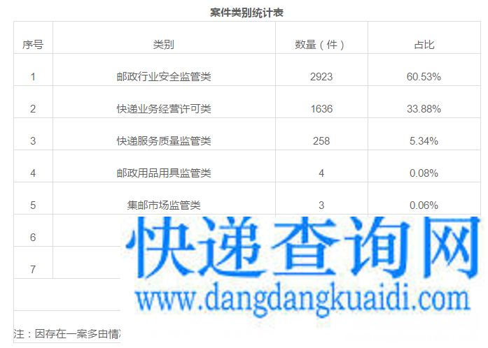 按照邮政市场行政处罚案件类别统计,七类案件数量依次为邮政行业安全监管类件2923件,快递业务经营许可类1636件,快递服务质量监管类258件,邮政用品用具市场监管类4件,集邮市场监管类3件,市场秩序类3件,行政管理秩序类2件。