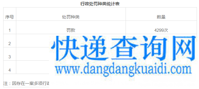 行政处罚种类统计表 按照处罚种类统计,全年各级邮政管理部门共作出罚款4299次,停业整顿266次,警告90次,吊销许可证3次。