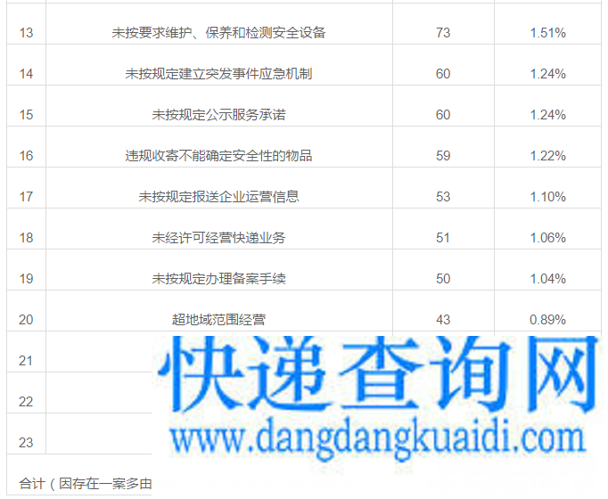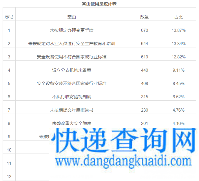 按照案由使用次数统计,邮政市场案件中排名前十的违法行为分别是未按规定办理变更手续(670件,占比13.87%),未按规定对从业人员进行安全生产教育和培训(644件,占比13.34%),安全设备使用不符合国家或行业标准(619件,占比12.82%),设立分支机构未备案(440件,占比9.11%),安全设备安装不符合国家或行业标准(408件,占比8.45%),不执行收寄验视制度(315件,占比6.52%),未按期提交年度报告书(230件,占比4.76%),未整改重大安全隐患(201件,占比4.16%),未按规定记录和保存寄递服务信息(135件,占比2.80%),委托未经许可企业经营(115件,占比2.38%)。