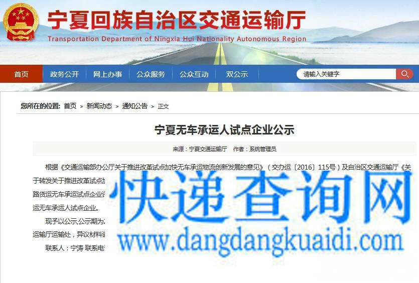 以下为其公示原文摘录根据《交通运输部办公厅关于推进改革试点加快无车承运物流创新发展的意见》(交办运〔2016〕115号)及自治区交通运输厅《关于转发关于推进改革试点加快无车承运物流创新发展的意见的通知》(宁交办发(2016)228号文件)的要求,宁夏交通运输厅组织了道路货运无车承运试点企业评审工作。通过现场答辩、专家评审等规定程序,拟确定宁夏众力北斗卫星导航信息服务有限公司为宁夏道路货运无车承运人试点企业。