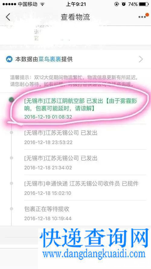 圆通速递在12月20日的《告客户书》中称,由于受中国北方雾霾影响,山东、河南、安徽、贵州、湖南、广西、辽宁等地区有大雾、强浓雾或特强浓雾天气。以上地区,快件揽收、中转、派送预计影响1-2天。