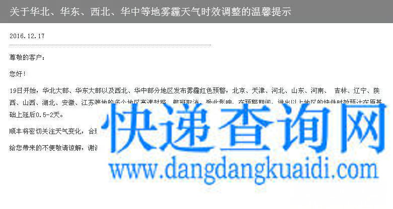 12月20日,顺丰速递也在其官网发布19日开始,华北大部、华东大部以及西北、华中部分地区发布雾霾红色预警,北京、天津、河北、山东、河南、吉林、辽宁、陕西、山西、湖北、安徽、江苏等地的多个地区高速封路、航班取消。受此影响,在预警期间,进出以上地区的快件时效预计在原基础上延后0.5-2天。