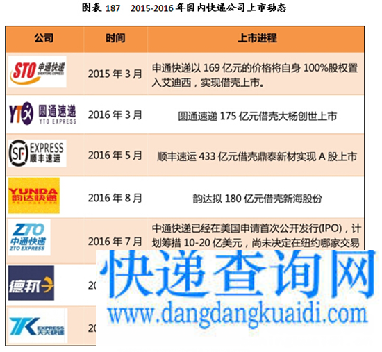 中投顾问在《2017-2021年中国快递业投资分析及前景预测报告》中指出,2015年以来,我国快递行业已经进入全方位拥抱资本的阶段,资本市场的运作已经被视为维持地位或者弯道超车的必备条件,而资本的推波助澜也加剧了行业内的明争暗战。除了在A股借壳上市的4家快递企业之外,中通、百世、德邦、全峰、天天等都在谋划上市,快递行业开始进入资本追逐阶段。