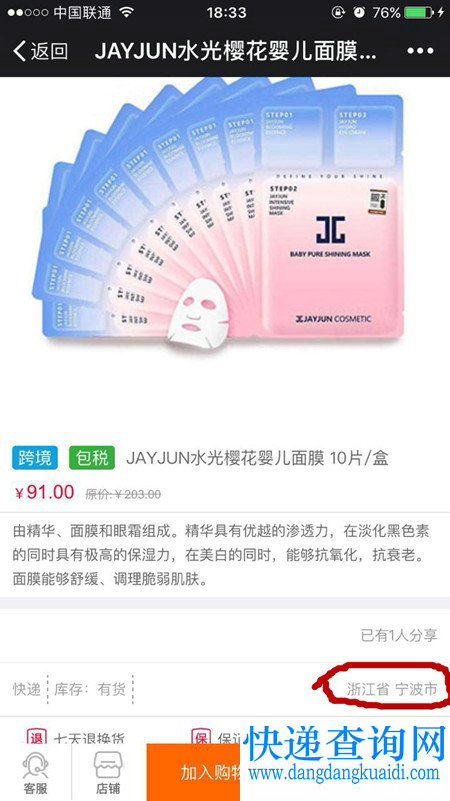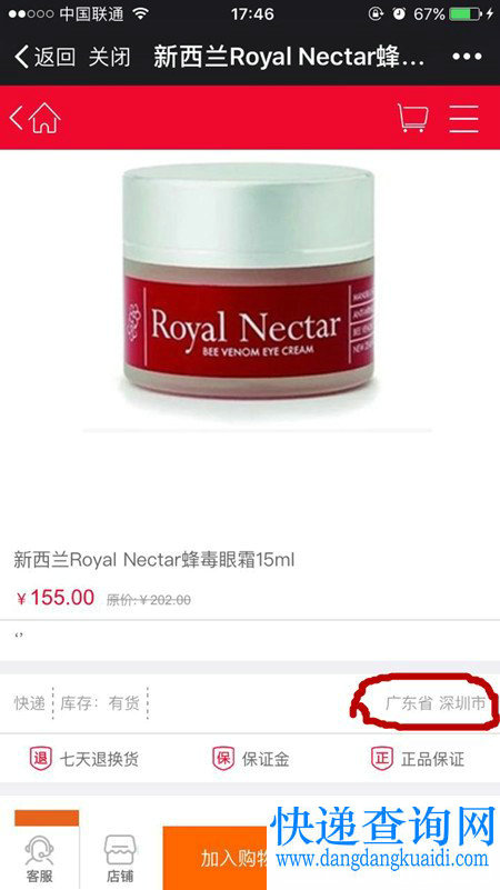 ,该商城还设有海外直邮频道。但目前该频道似乎还不太完善、也不那么的“海外”。点击进入后任意选取其中一款产品——新西兰Royal Nectar蜂毒眼霜,详情页显示着“广东省深圳市”,另一款JAYJUN水光樱花面膜的则显示着“浙江省宁波市”。