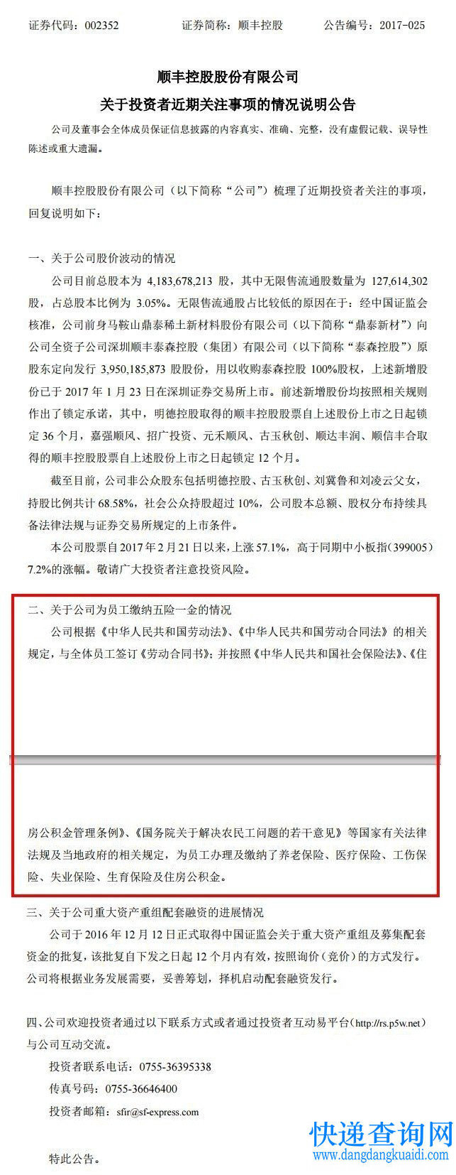 今日,顺丰控股(002352)发布公告,回应了投资者近来关心的问题。其中,针对“顺丰快递员无五险一金”传闻,公告回应投资者一直以来,按照规定与全体员工签订劳动合同,并为员工办理缴纳五险一金。