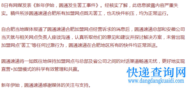 2月9日下午,圆通速递通过国邮新媒独家回应《新年伊始,圆通发生罢工事件》的报道内容严重失实,圆通速递合肥所有加盟网点既无罢工,也无快件积压,均为正常运行。