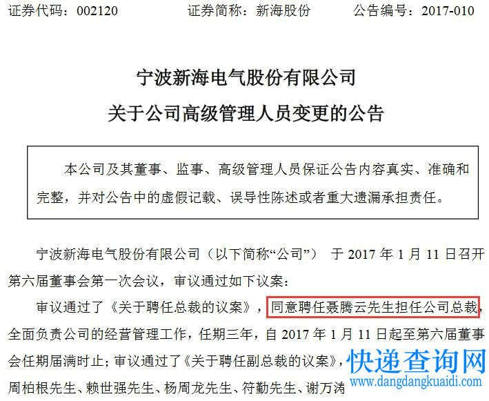 获悉,宁波新海电气股份有限公司(以下简称“新海股份”)于1月11日召开第六届董事会第一次会议,审议通过了《关于聘任总裁的议案》,同意聘任聂腾云担任新海股份的总裁。