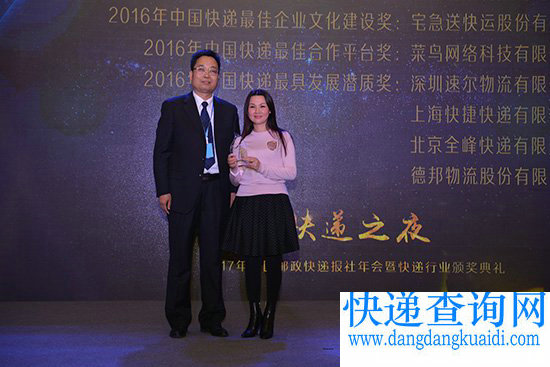 1月18日, 2017“快递之夜”中国邮政快递报社年会暨快递行业颁奖典礼在北京隆重举行。申通快递董事长、总裁陈德军、副董事长陈小英出席颁奖典礼,董事长、总裁陈德军荣获“2016年中国快递行业魅力人物 ”奖,副董事长陈小英则斩获了本次典礼唯一一个象征着行业女性从业者榜样的木兰奖。,申通快递还荣获“2016年中国快递最佳国际业务拓展奖。”