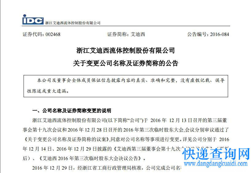 公告还表示,经公司申请,并经深圳证券交易所核准,公司证券简称自2016 年 12 月 30 日起由“艾迪西”变更 为“申通快递”,公司证券代码“002468”不变。
