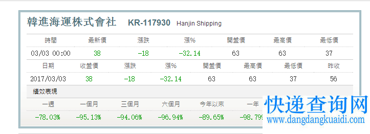 而目前韩进海运(股票代码KR-117930)交易日显示的是3月3日,股价是38韩元,总量为69802300,近一周内连续下跌78.03%。