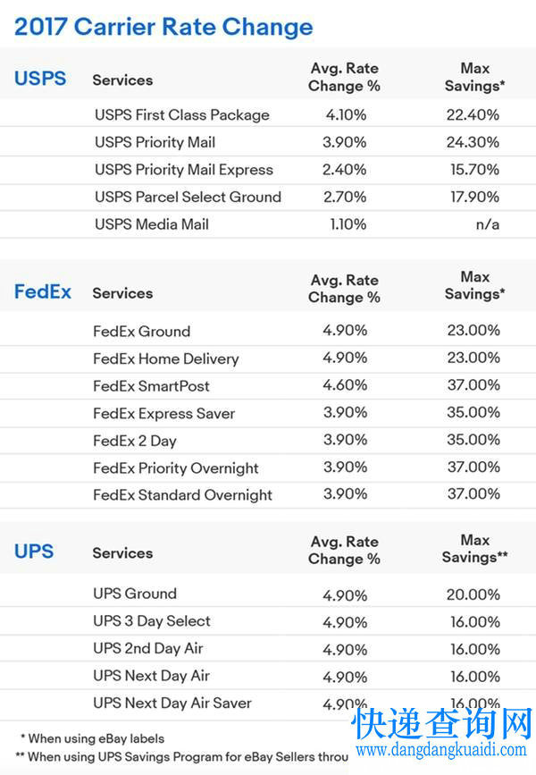 据了解,UPS(联合包裹服务公司)、FedEx(联邦快递)和USPS(美国邮政服务公司)已经公告,他们将上调2017年的资费费率,新的资费费率将于下列日期正式生效