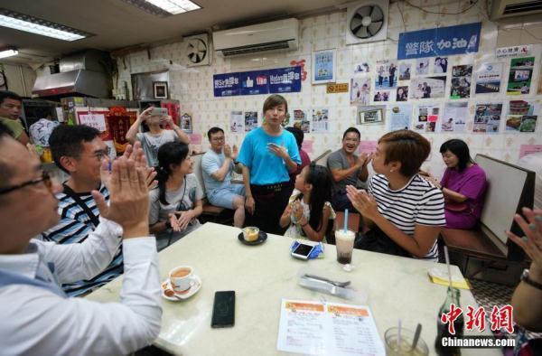 8月17日中午,香港银龙咖啡茶座女店主李凯瑚参加撑警活动后遭报复的消息经媒体报道后,众多香港市民和内地游客慕名而来,店内宾客满座,许多顾客纷纷向她表达敬意和支持。(图片来源张炜/中国新闻社)