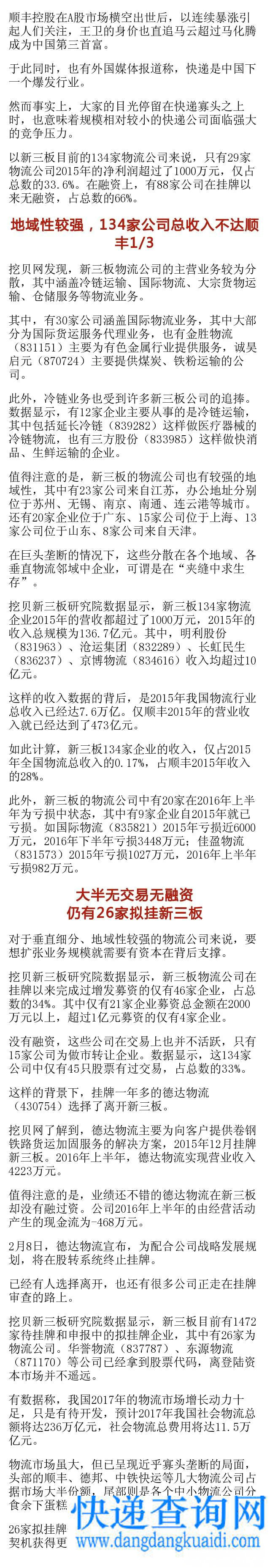 新三板物流股遇冷:134家公司总收入不及顺丰1 :顺丰快递电话号码 :2018-10-18 14:34 来源:www.dangdangkuaidi.com :次 挖贝新三板研究院数据显示,新三板物流公司在挂牌以来完成过增发募资的仅有46家企业,占总数的34%。其中仅有21家企业募资总金额在2000万元以上,快递物流查询,物流快递查询,遵义快递,快递到货,圆通快递员,国际寄快递,超过1亿元募资的仅有4家企业。 上一篇:海外快递市场无关键突破 顺丰、圆通加速"出 下一篇:中物联医药物流分会2017年会长办公会在顺丰总部 顺丰快递单号查询,顺丰快递费用价格表,顺丰物流公司,顺丰电话95338,顺丰速运单号查询 【快递】新闻头条最新消息 2025-09-271DHL快递信息在线申报渠道操作流程 2025-09-272京东1公斤省内快递怎么收费 2025-09-273德邦物流要是邮寄行李箱是怎样收取运费的 2025-09-274tnt单号查询爱查快递 2023-05-065张继科为什么敢要景甜 2023-04-186方向盘突然抱死吓坏孕妇 特斯拉回应 2023-04-187中国女排2023年集训名单公布 2023-04-178妈妈生二胎 16岁大女儿抑郁自残 2023-04-179烤肠一根3元两根5元 女子报警称诈骗
