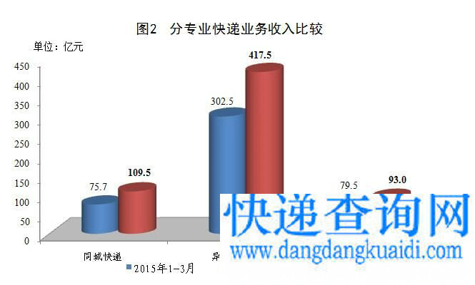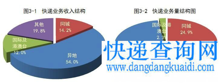 一季度,同城、异地、国际及港澳台快递业务收入分别占全部快递收入的14.2%、54%和12%;业务量分别占全部快递业务量的24.9%、72.8%和2.3%。与去年同期相比,同城快递业务收入的比重上升0.3个百分点,异地快递业务收入的比重下降1.6个百分点,国际及港澳台业务收入的比重下降2.6个百分点。