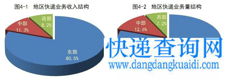 一季度,东、中、西部地区快递业务收入的比重分别为80.5%、11.3%和8.2%,业务量比重分别为80.2%、12.6%和7.2%。与去年同期相比,东部地区快递业务收入比重下降了0.8个百分点,快递业务量比重下降了0.8个百分点;中部地区快递业务收入比重上升了0.9个百分点,快递业务量比重上升了1个百分点;西部地区快递业务收入比重下降了0.1个百分点,快递业务量比重下降了0.2个百分点。